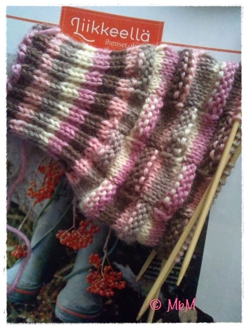 Malli suunniteltu ohuelle langalle, mutta kun olin kyläreissulla, ei ollut mukana yksiväristä muuta kuin 7-veljestä Opi villasukkalankaa, joten siitä aloitin tekemään 2,5 mm:n puikoilla.